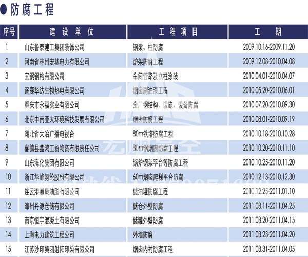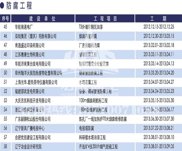 宏順建設(shè)工程有限公司是國家批準(zhǔn)成立的專業(yè)高空作業(yè)企業(yè):承攬過(國內(nèi).國外)煙囪新建、煙囪防腐、吊機(jī)防腐、水塔防腐、管道防腐、龍門吊防腐、儲(chǔ)存罐防腐、煙囪內(nèi)壁防腐等高空作業(yè)工程。具有“不搭腳手架 、 不需要停產(chǎn)”施工特點(diǎn)。